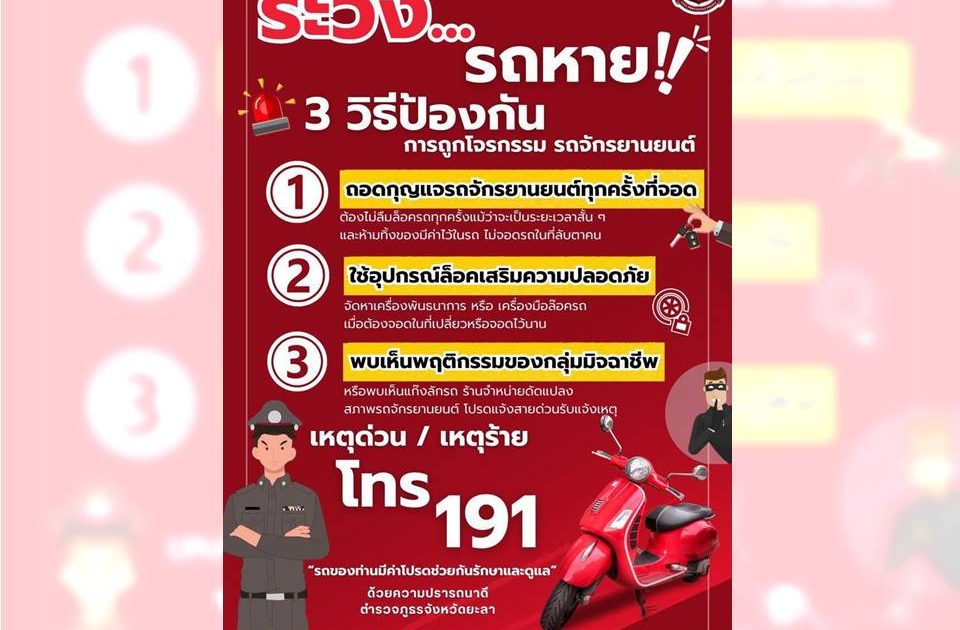 ตำรวจภูธรจังหวัดยะลา ขอความร่วมมือจากพี่น้องประชาชนจังหวัดยะลา ร่วมป้องกันรถหาย โดยเฉพาะรถจักรยานยนต์