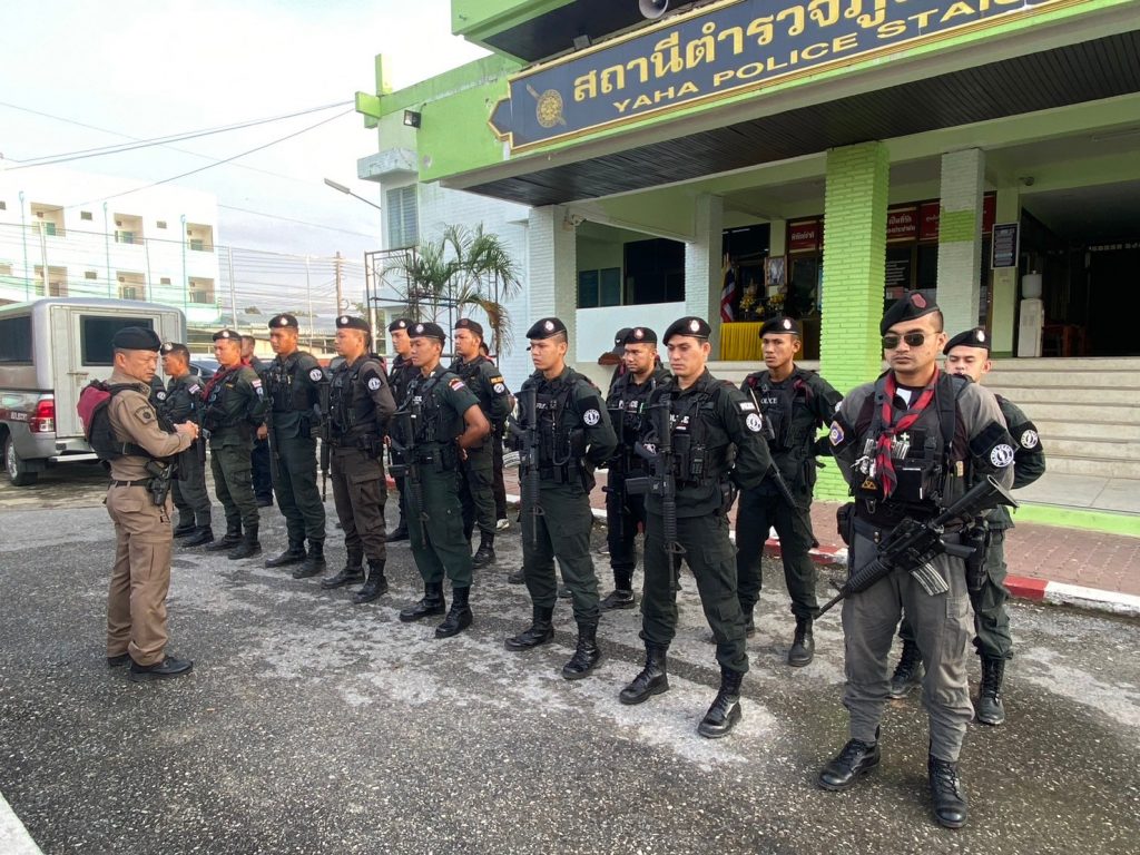 ว่าที่ พ.ต.อ.ฉัตรชัย ศักดิ์ดี ผกก.สภ.ยะหา พ.ต.ท.สุนทร อัมโร สวป.สภ.ยะหา ว่าที่ พ.ต.ต.โชติพันธุ์ วีรพัฒนานนท์ สว.สส.สภ.ยะหา ร้อยเวร 2-0 ได้ปล่อยแถวกำลังตำรวจชุด ชป.อัสนีย์ , ชป.สืบสวน.สภ.ยะหา ภารกิจปิดล้อม ตรวจค้น ในพื้นที่ ต.กาตอง อ.ยะหา จ.ยะลา